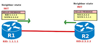 In this state when the router receives a hello message from the other router, it checks the required conditions are matching or not. If the conditions to form the neighborships are matching then the router puts the RID of the other router in the hello message acknowledging that it received the other router's hello message and its ready to form the neighborship. When the other router receives the hello message which contains its own RID, the router moves to 2-way state. The same is the case with other router as well.